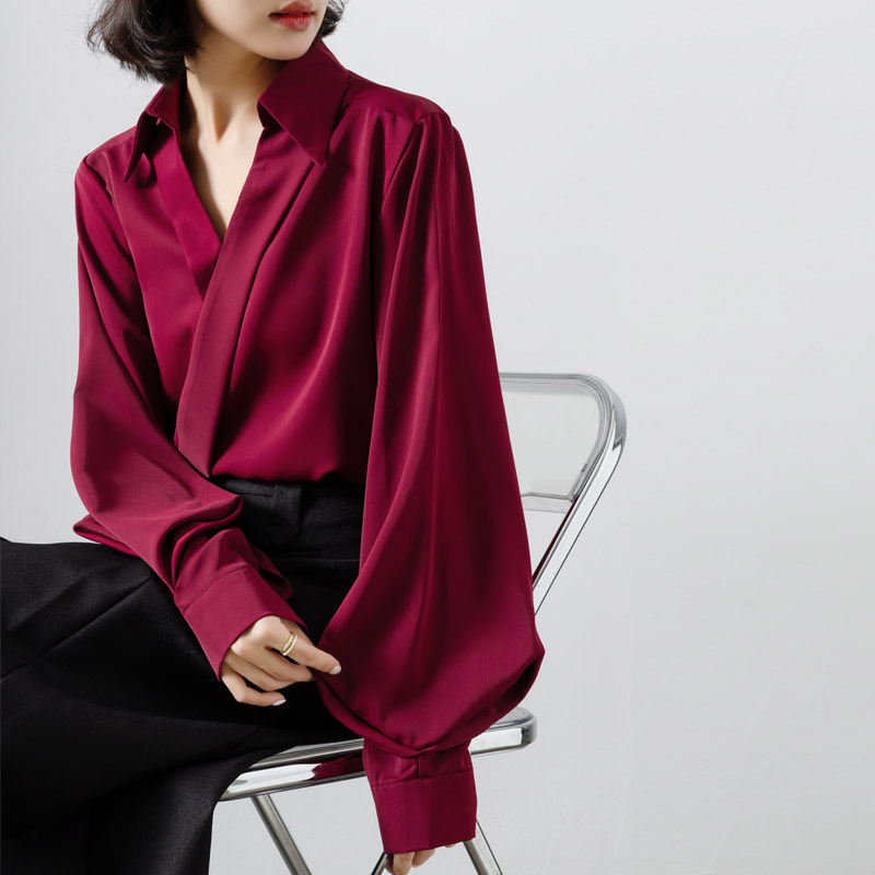 気質高級アンコラ赤い長袖シャツ女性ファッション洋風通勤シフォンvネック大灯籠袖上着
