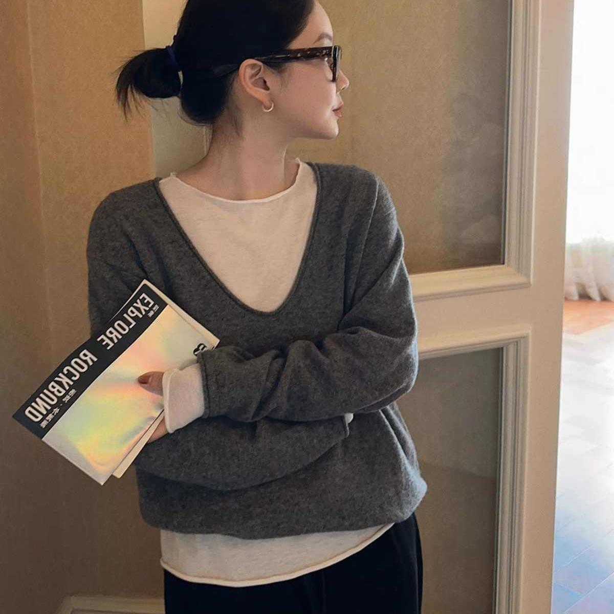 純粋でセクシーなvネックの柔らかいベルベットの長袖tシャツの女性の秋の2024の新しい甘辛の中にベルベットの修身上着を掛けます