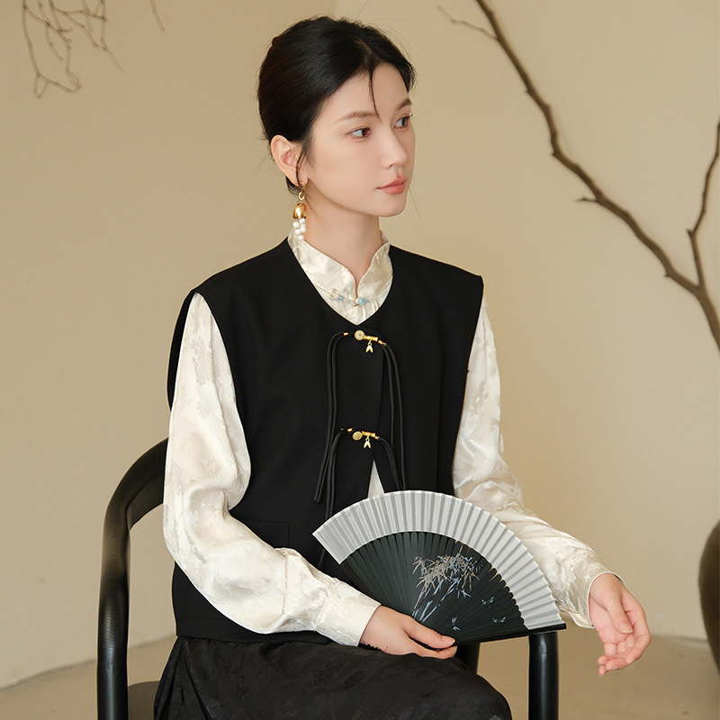 2023秋冬女性ベスト新中国風手作り盤ボタン綾小カシミヤ毛黒修身馬甲