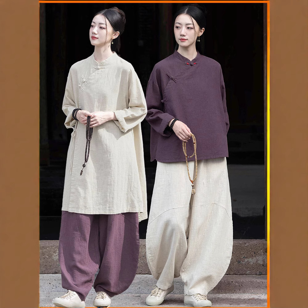 修行禅服女性仏系禅意女装綿麻セット素衣中国式斜め襟上着寺院居士服女性モデル