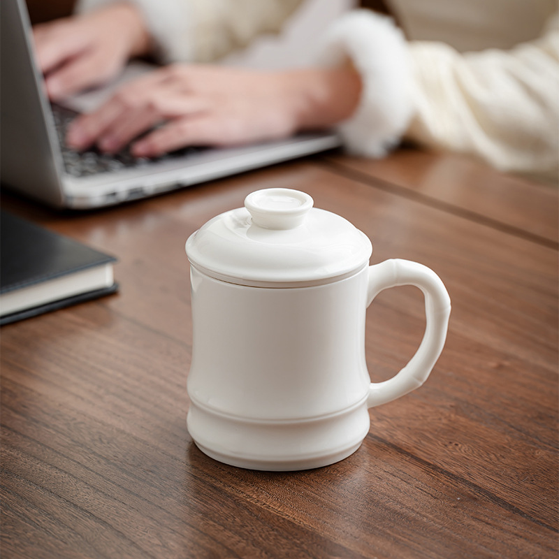 竹報平安手作り羊脂玉磁器オフィスカップ陶磁器家庭用蓋付きコップ茶分離カップマグカップ
