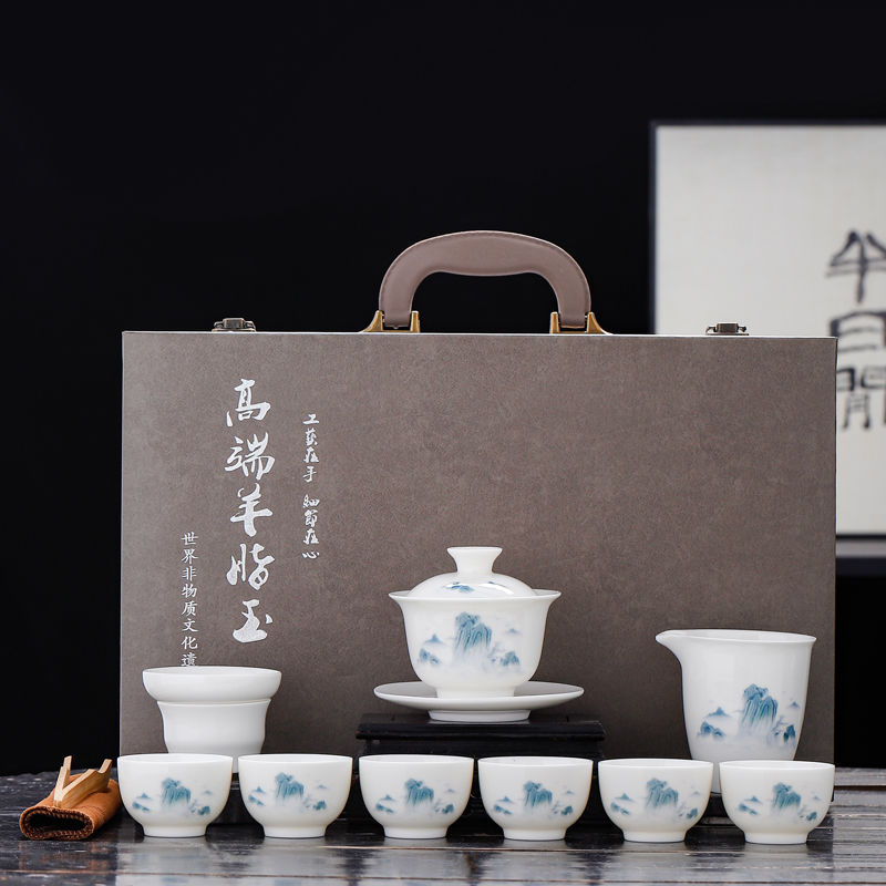 徳化羊脂翡翠カンフーアイス種白磁ティーセットホームオフィスセラミックカバーボウルハイエンドコンプリートセット