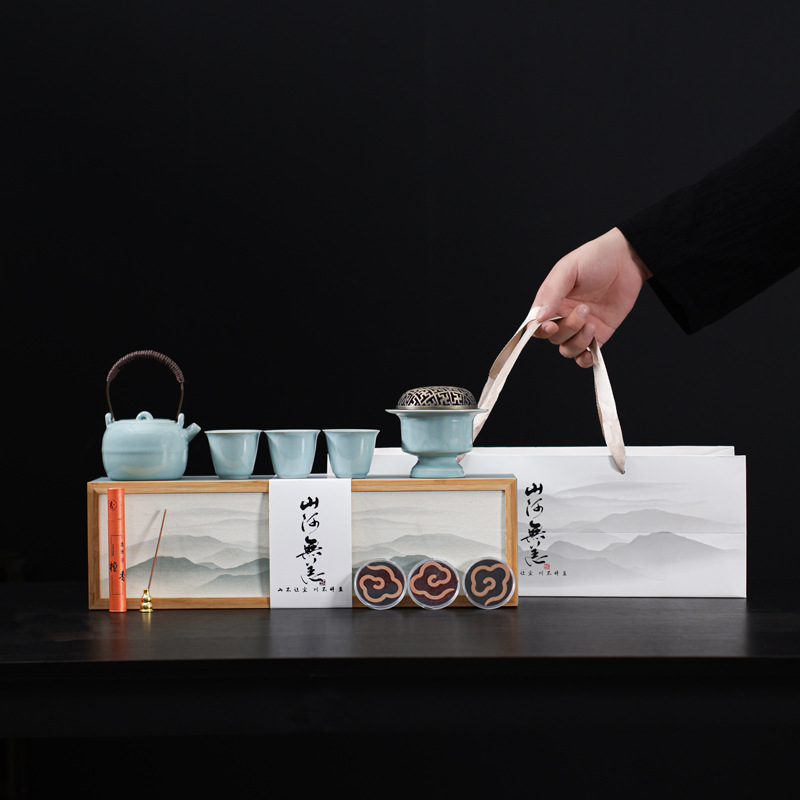 天青汝窯茶器香炉セット、茶托付き、乾式泡立て器、ビジネスギフト、開店祝い、新築祝い、ギフトボックス入り汝磁器