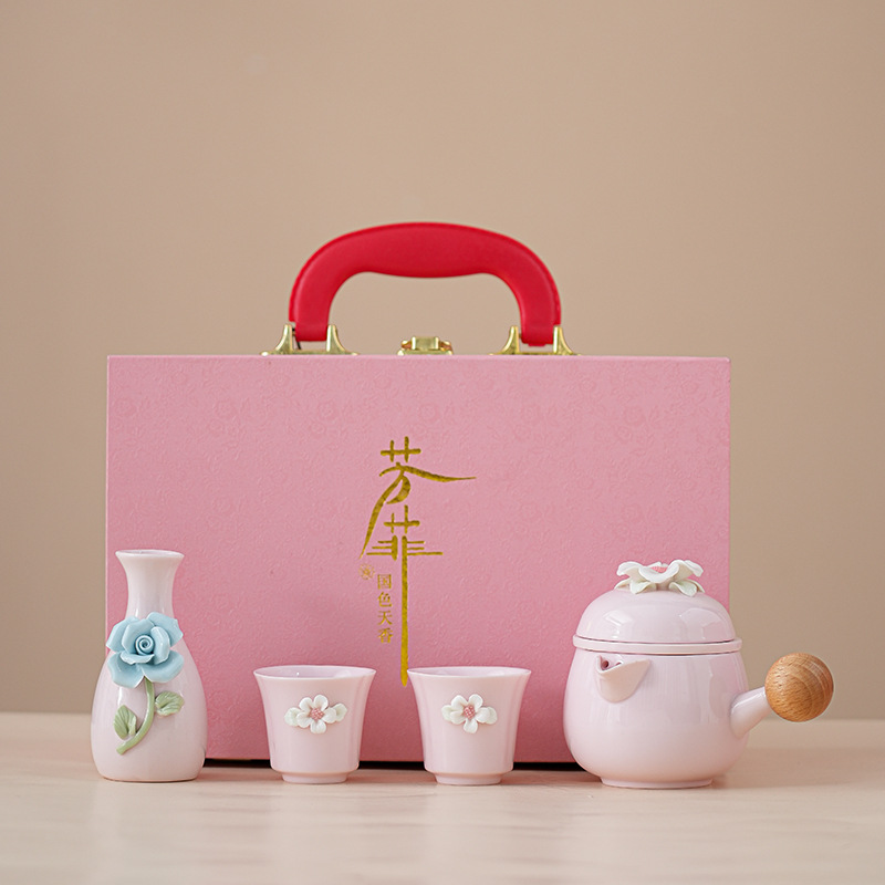 ピンクのピンチフラワー旅行ティーセット小さな屋外カンフーティーカップポータブルお土産セットギフト親友の誕生日ギフト