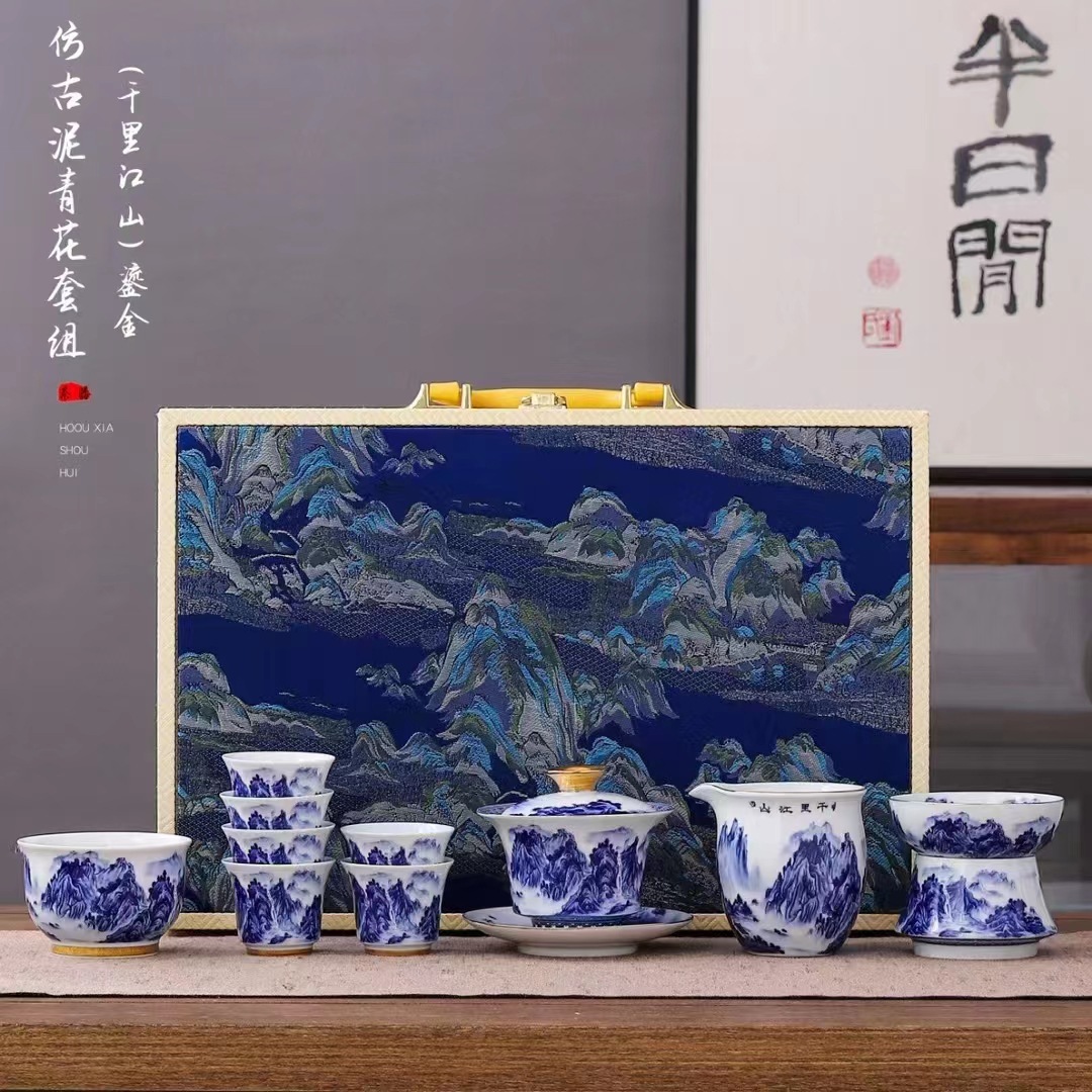 模造古高白泥青花磁器千里江山図蓋碗工夫茶器礼箱セット企業ビジネスプレゼント