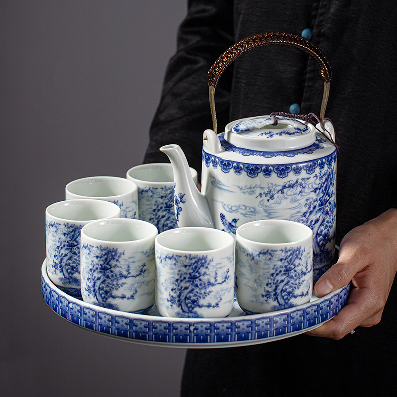 大容量提梁壺茶器トレー付礼箱セット高白青花磁器喜上眉梢水具年長者プレゼント
