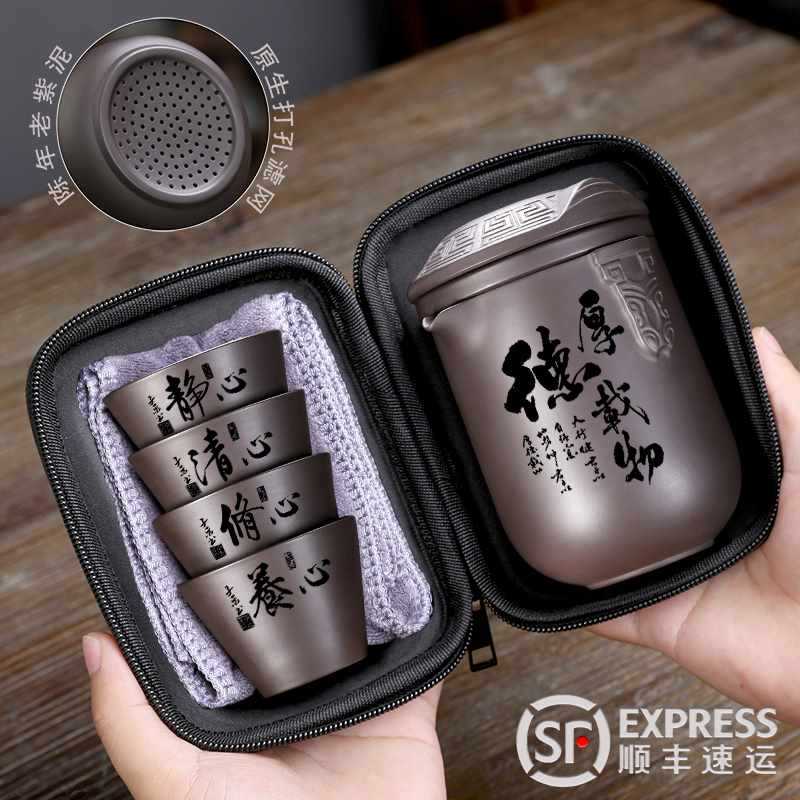 ✅ 紫砂トラベルティーセット小型セットポータブルブラックバッグ1ポット4カップ大容量屋外小規模ビジネス
