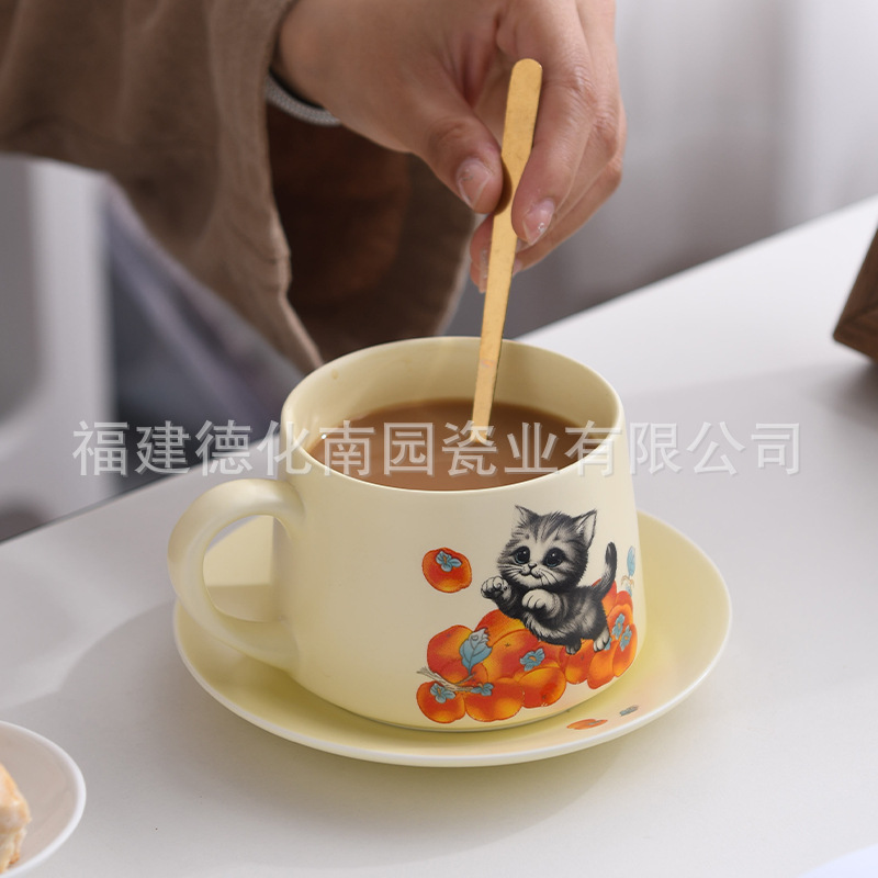 柿猫ベージュ汝窯マグカップセラミックホームオフィス茶水分離パーソナルティーカップ蓋付き