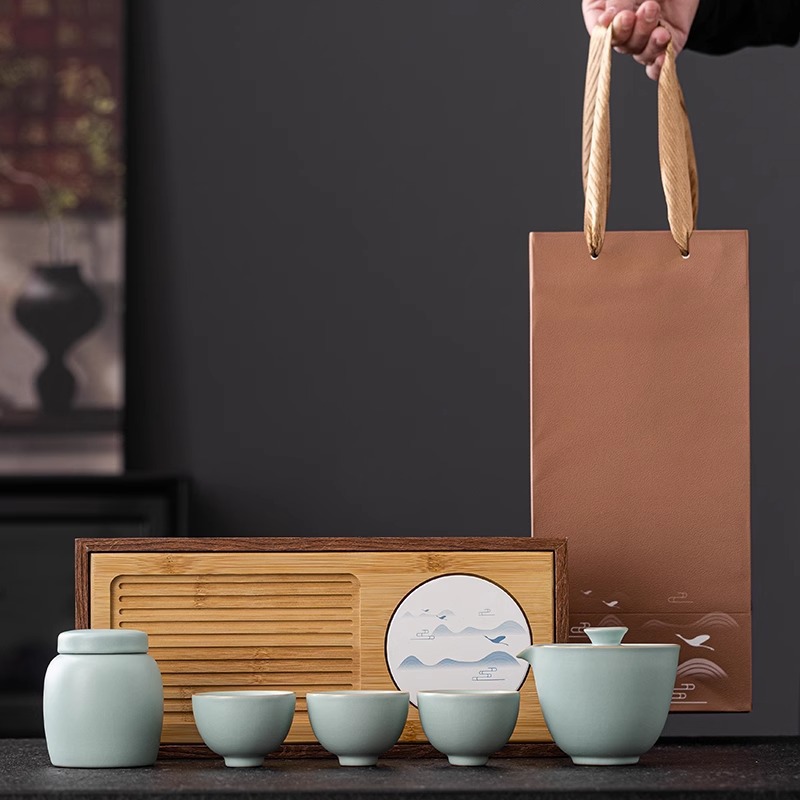 汝窯格窯セラミックティーセットギフトセットカンフーティーカップトラベルティーセットクイックカップ中国茶ボウルお土産