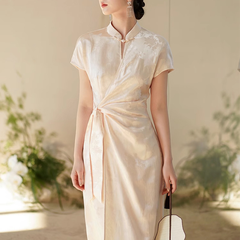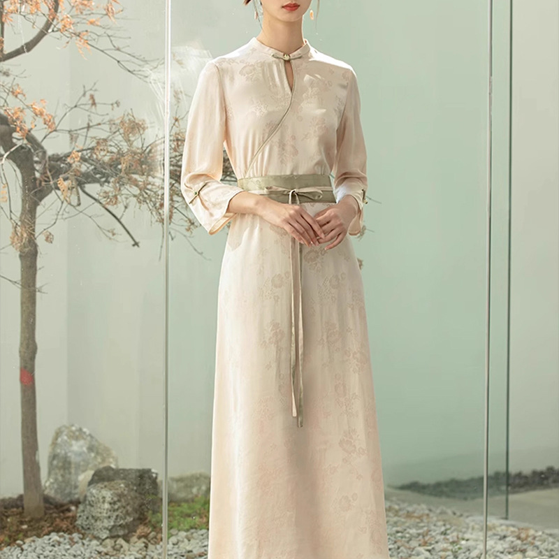 卿淑斎新中国式改良チャイナドレス立襟ワンピース2025年夏新作レトロジャカード気質ロングスカート