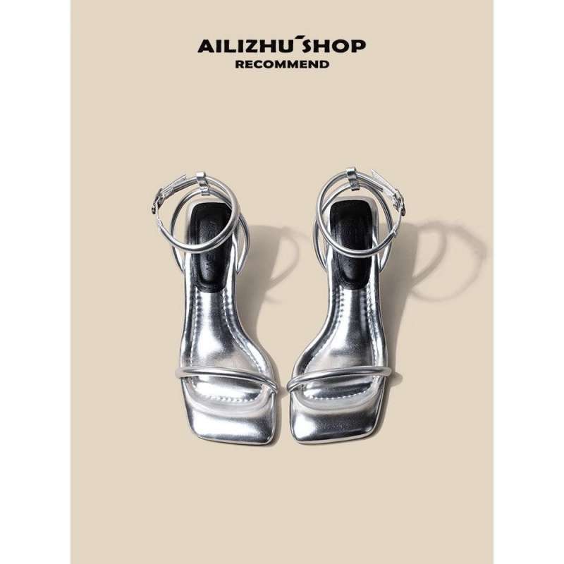 スカートストラップ付きローマンシルバーサンダル、レディースサマーアウター、2025新作フェアリーシューズ、スティレットヒール、美しいハイヒール