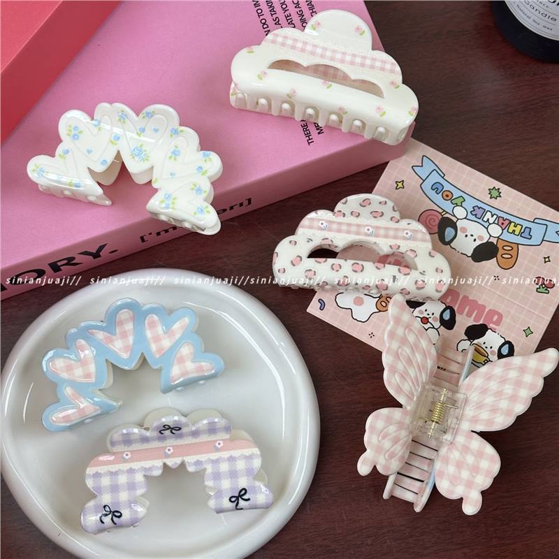 ミルキーチェック柄リボン花柄ヘアクリップ女性用夏後頭部ヘアシャーククリップヘアピンヘアアクセサリー