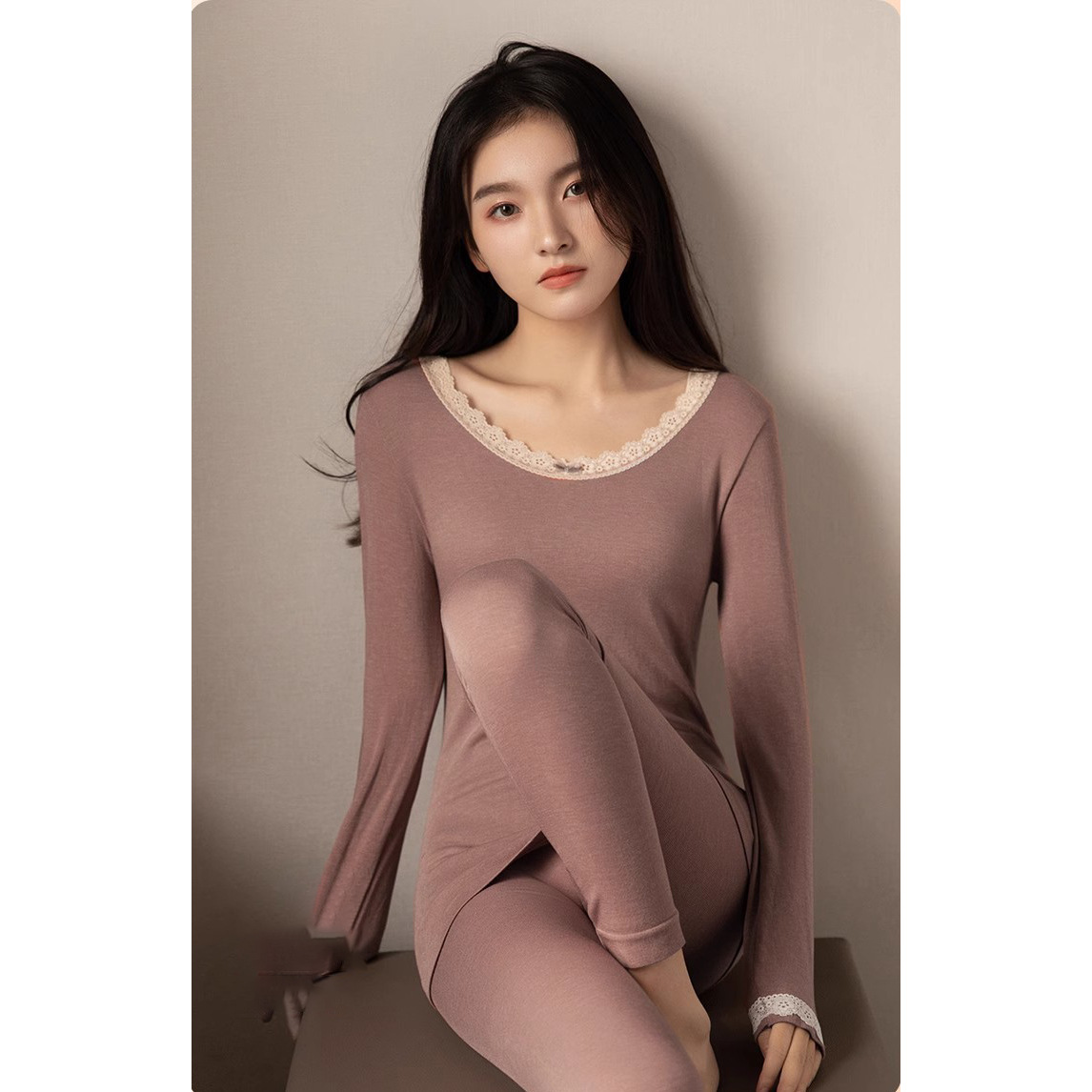 胸パッド付き秋冬薄手スリム低vネックセクシーレースセットモーデール秋衣秋ズボン女子20060
