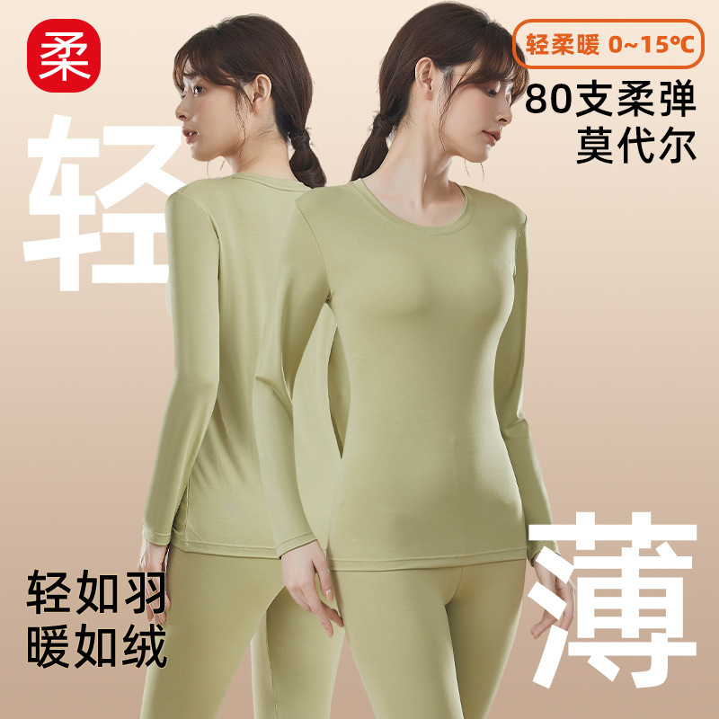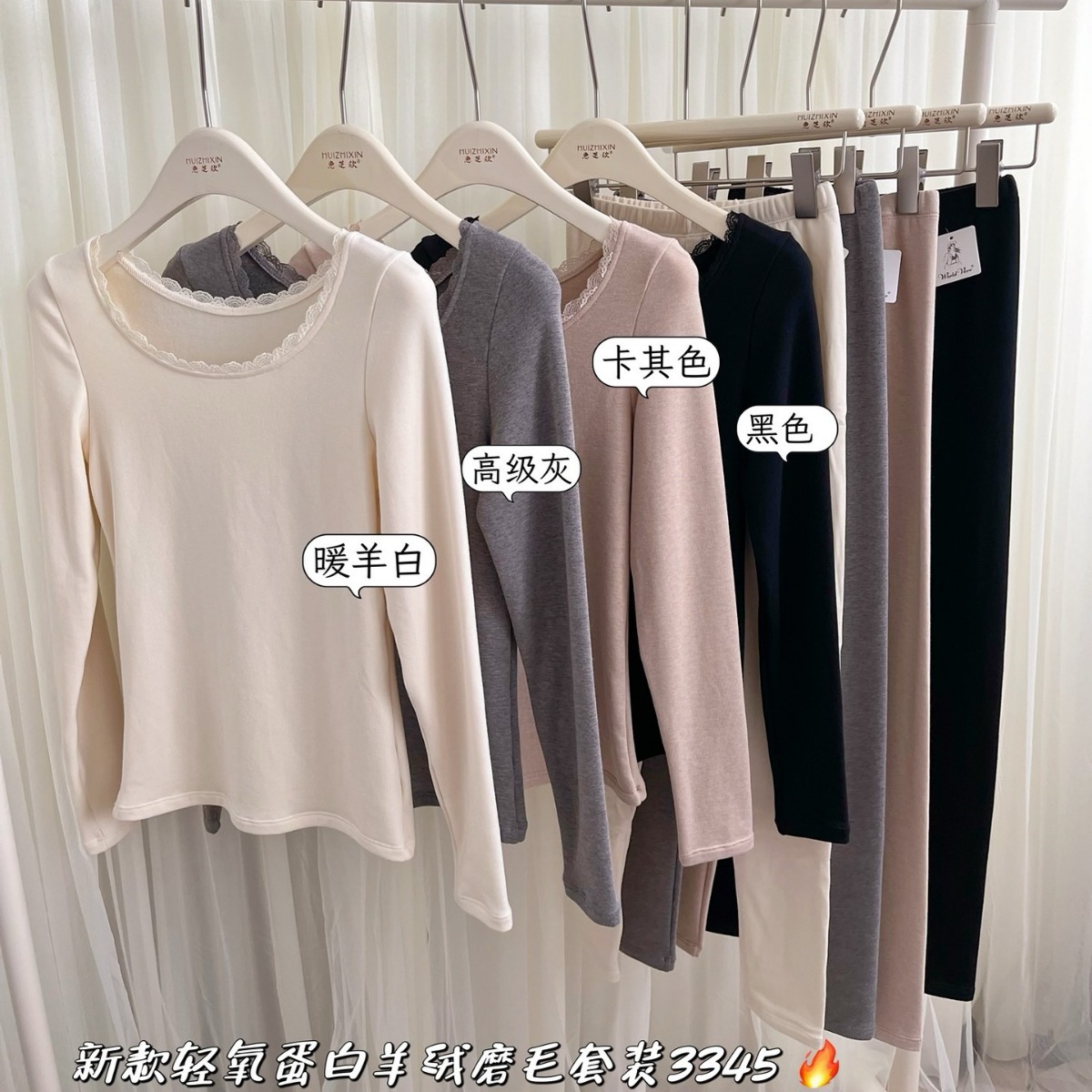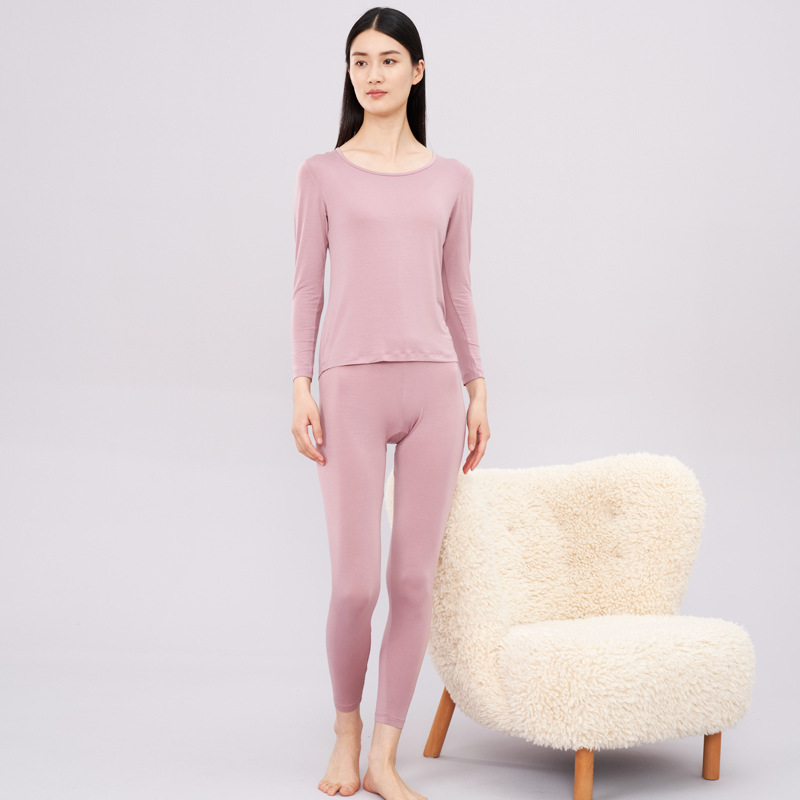 秋冬モデルのヒアルロン酸美肌服女性無痕保温スーツ恒温発熱修身丸襟打底秋衣秋ズボン