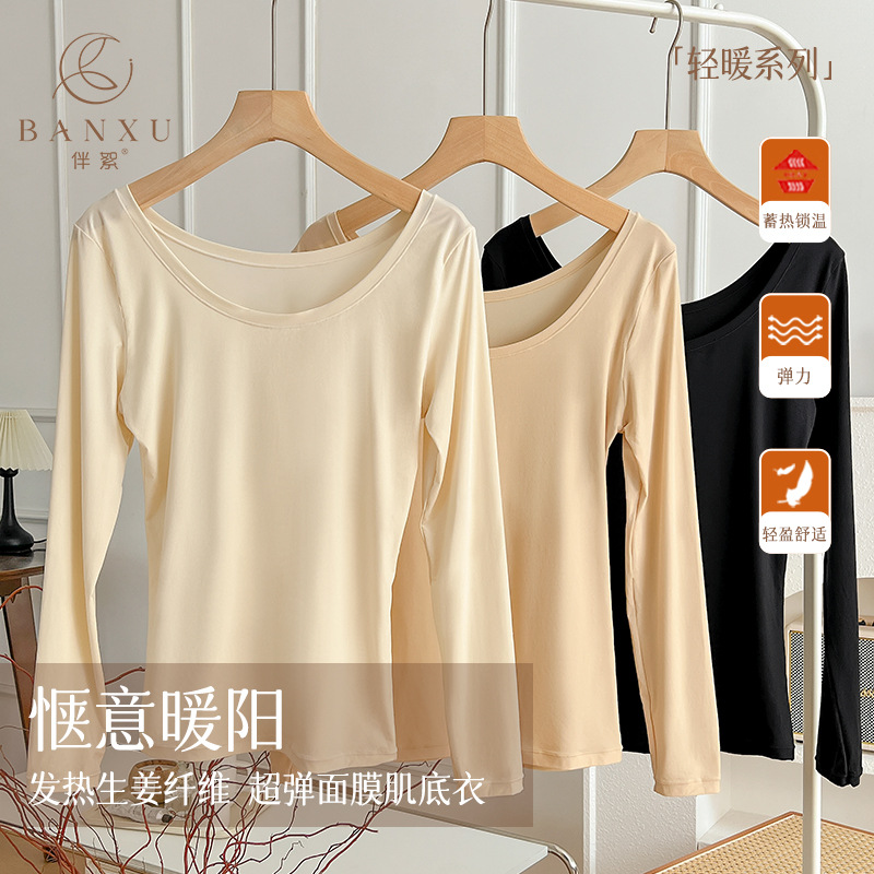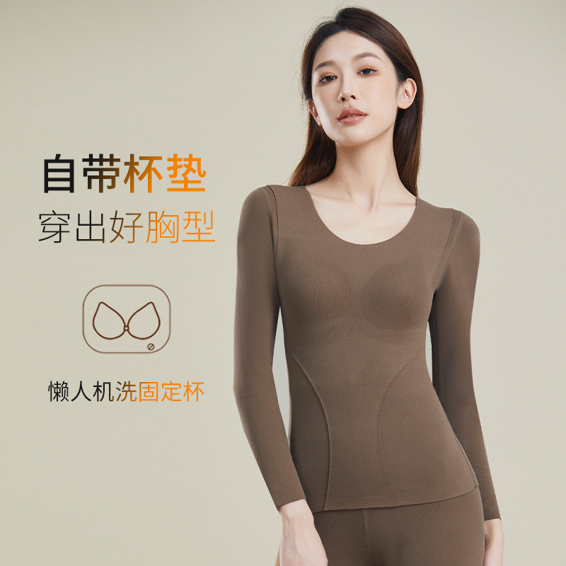 秋冬保温下着と胸パッド付き女性上着の長袖の中に薄い純色の保温シャツを着ている女性