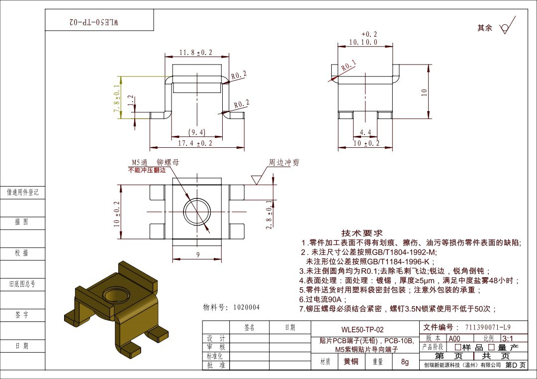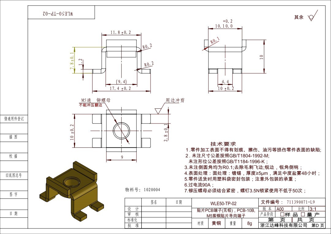 1020004-WLE50-TP-02パッチPCB端子 (鉛フリー) 、PCB-10B、m 5紫銅パッチ端