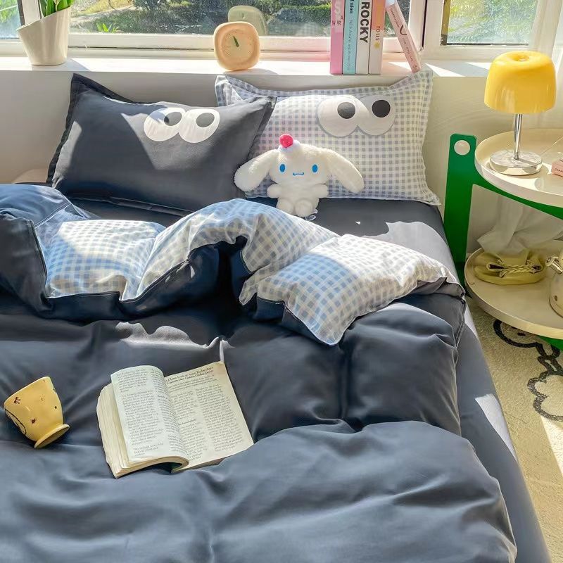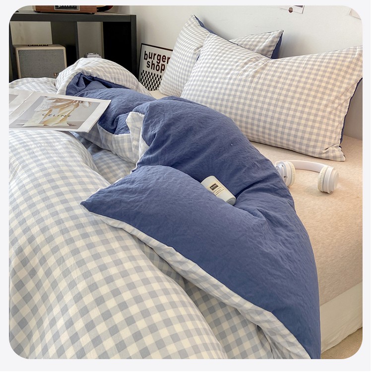 高級インスタイルミックスアンドマッチグレーブルーチェック柄ビッグアイ4点セット掛け布団カバー寝具シーツ寮3点セット