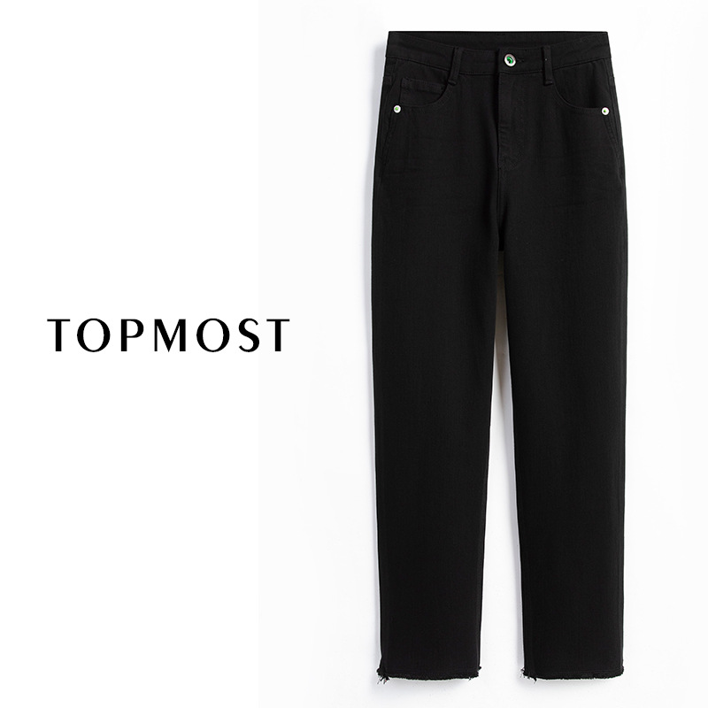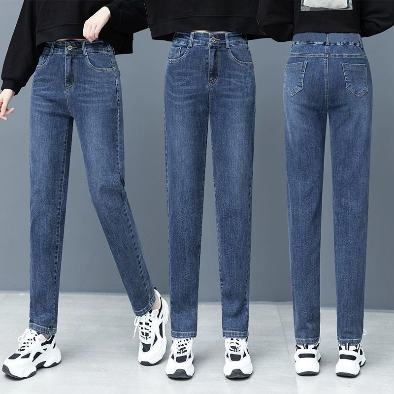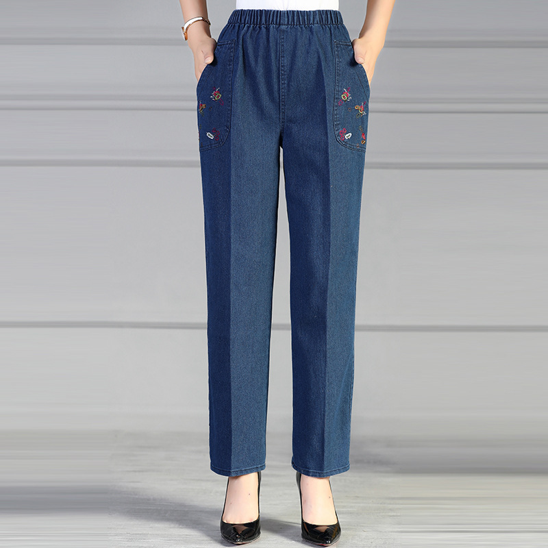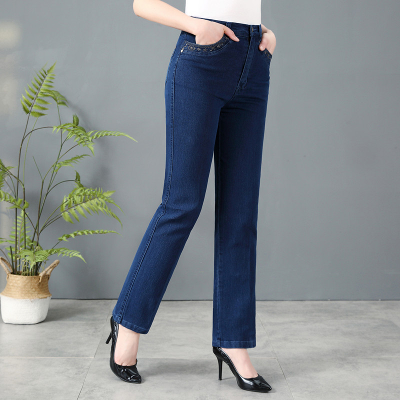春秋の新型の中高年ジーパンの女性のズボンのお母さんは腰の高い大きいサイズの弾力のストレートなズボンを詰めて中年のズボンをプラスします。