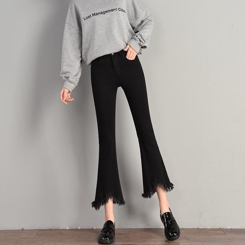 2024年夏の薄い黒いフリンジの毛の縁の小さいラッパのジーパンの女性のchiはやせている9分のズボンの小さいラッパのズボンを現します。