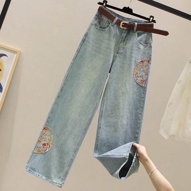 新中国式刺繍高腰国風広脚ズボンストレートジーンズ女性2024春中高年パンツ
