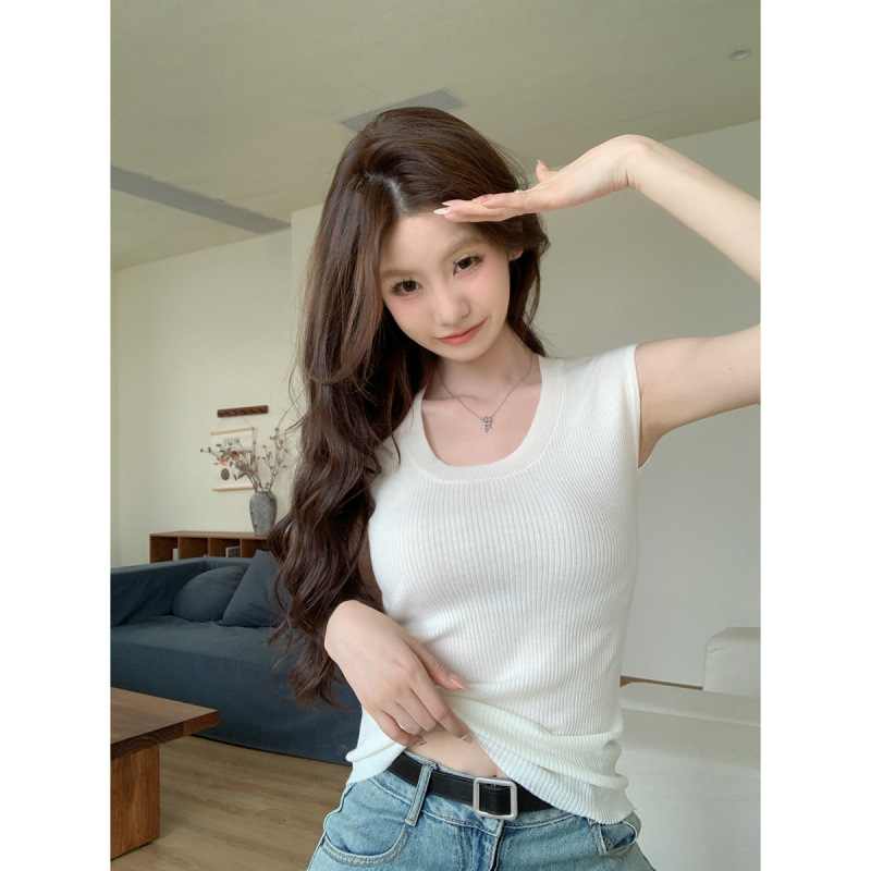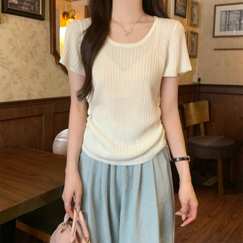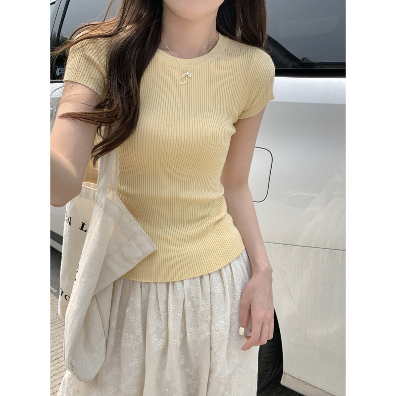 実物写真と実際の価格の夏の韓国風スリムフィットラウンドネックシンプルで多用途な無地アンディベルベットニット半袖トップ