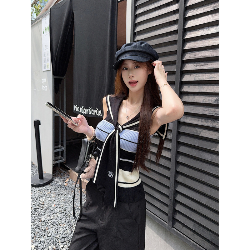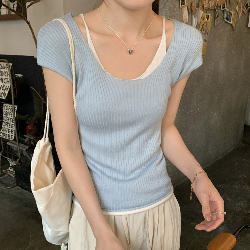 実物写真と実際の価格の夏の韓国風スリムフィットホルターネックコントラストカラーフェイクツーピースライト6ウールニット半袖トップ
