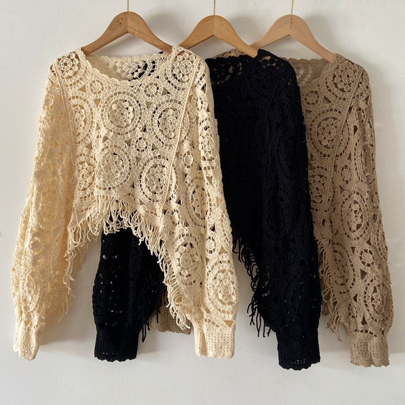 カラフルな中空かぎ針編みバットスリーブタッセルニットへそ出しトップホットガールタイルーズホリデースタイル長袖ブラウス