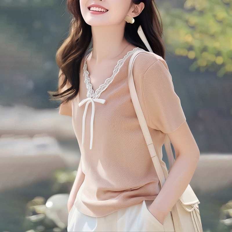 実物価格夏韓国版純粋な欲望レース痩身レースアップジャカードアンディベルベットセーター半袖トップ