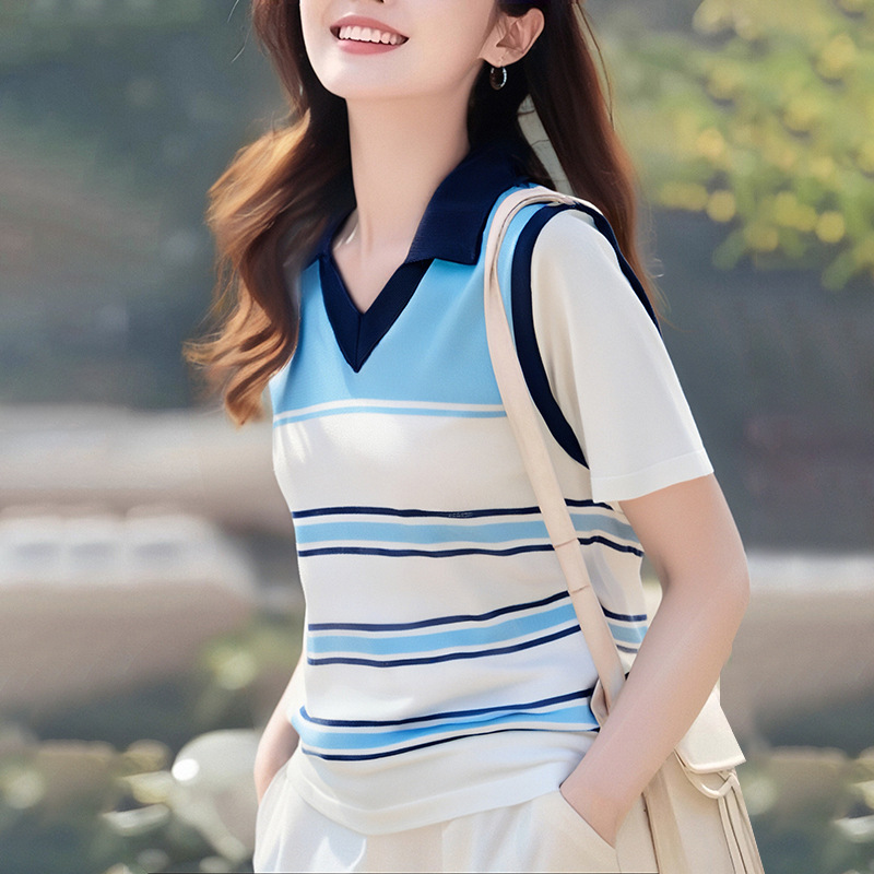 ポロカラーアイスシルクセーター女性用2025初春新作コントラストカラー年齢軽減外国風インナー半袖Tシャツトップ