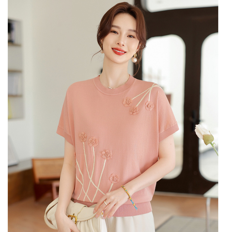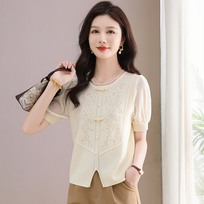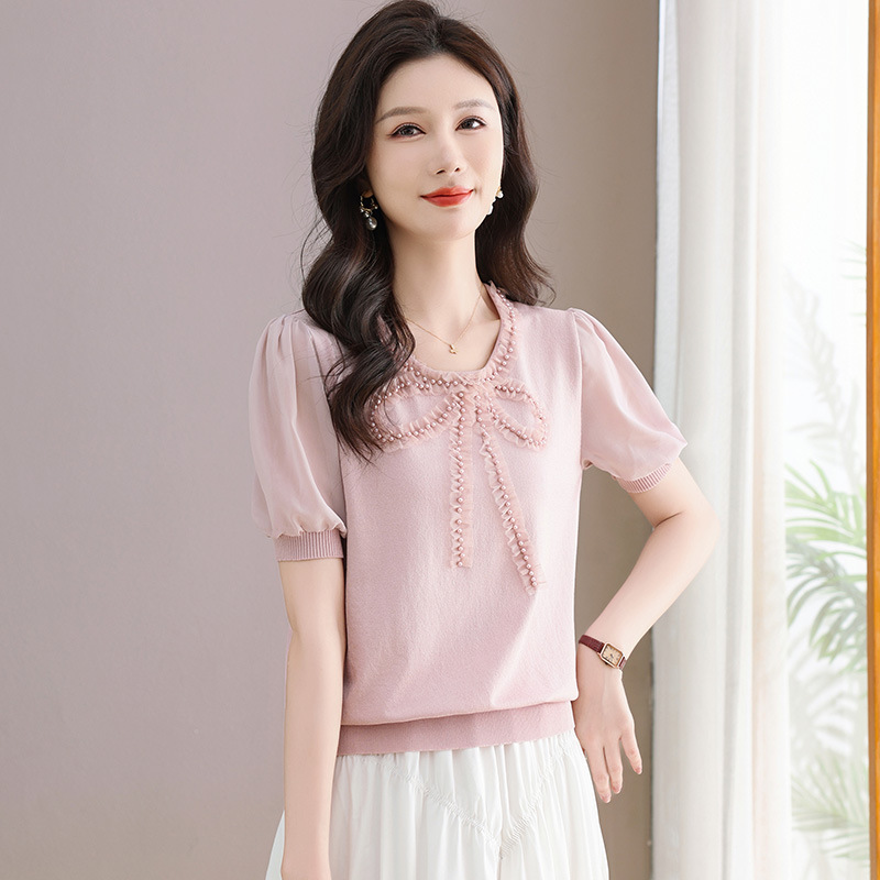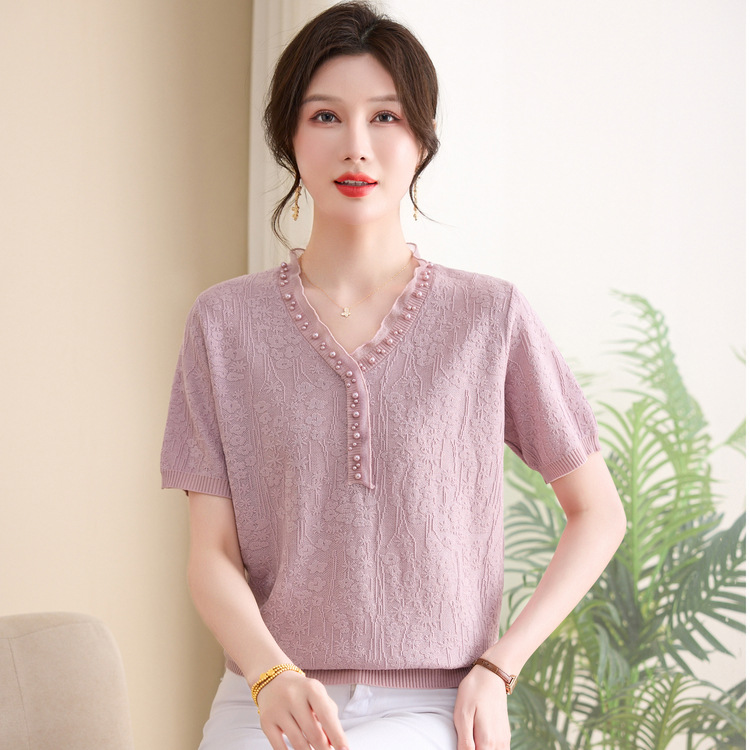 軽い高級感とハイエンドの見た目のアイスシルクビーズ中空薄手Tシャツシフォン半袖Tシャツレディースサマーニットセータートップ
