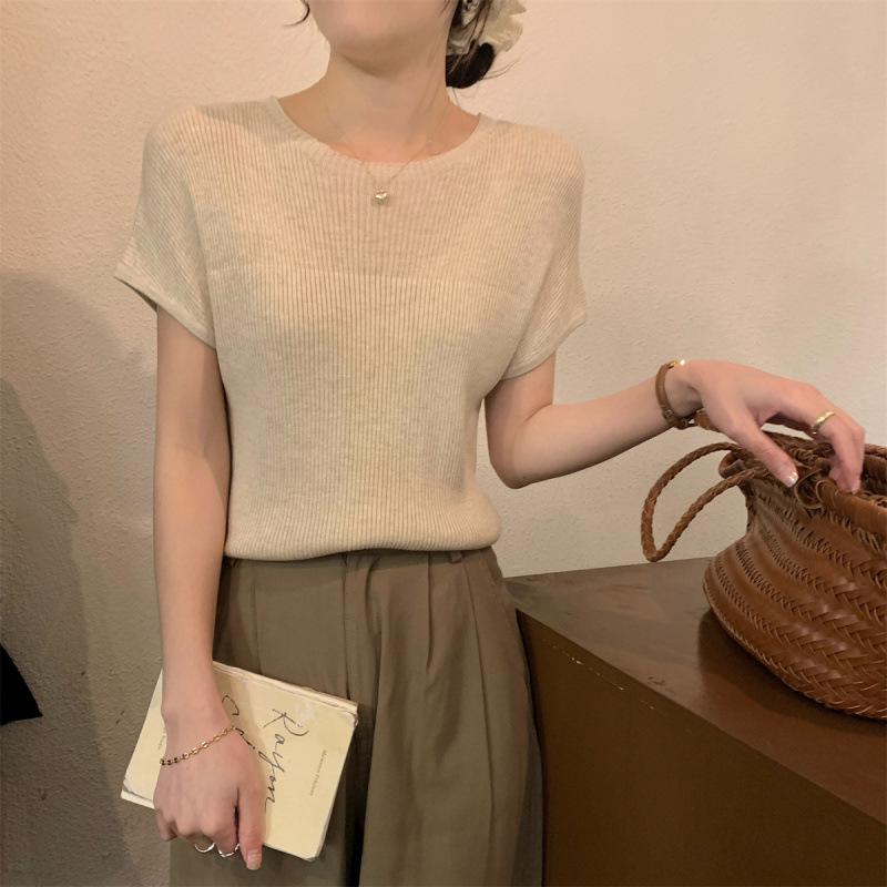 女性用ニット半袖Tシャツ、夏用薄手シャツ、ファッショナブル、スリム、多用途、ナチュラルスタイル、スリム、気質、ラウンドネックトップ