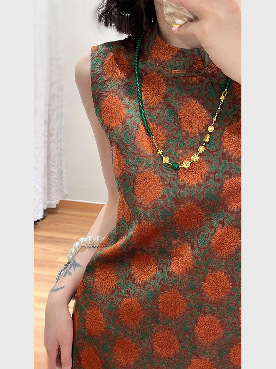 中国風の女性の中国風オレンジジャカードノースリーブシャツミッドレングス夏斜め襟ボタン唐スーツベスト