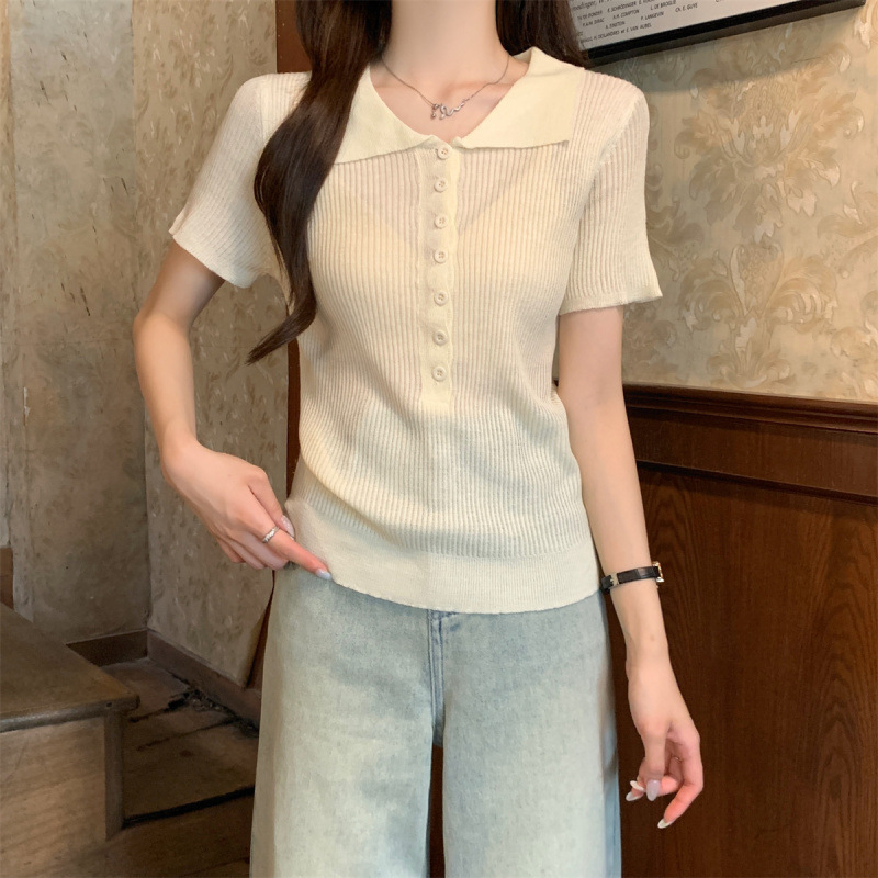 実物写真と実際の価格の夏韓国風ポロカラーボタンデザイン軽量6ウールセーター半袖トップ