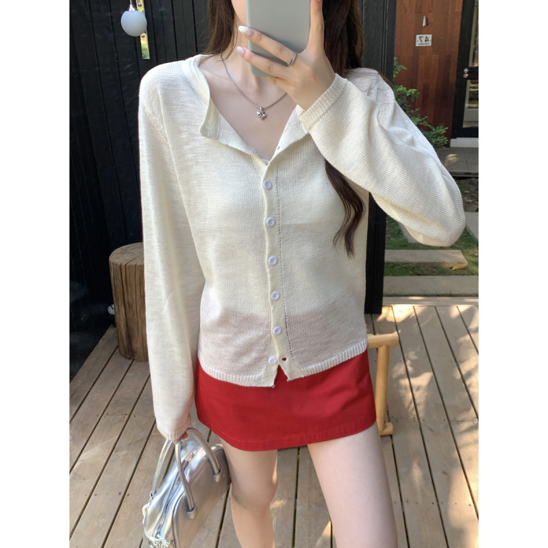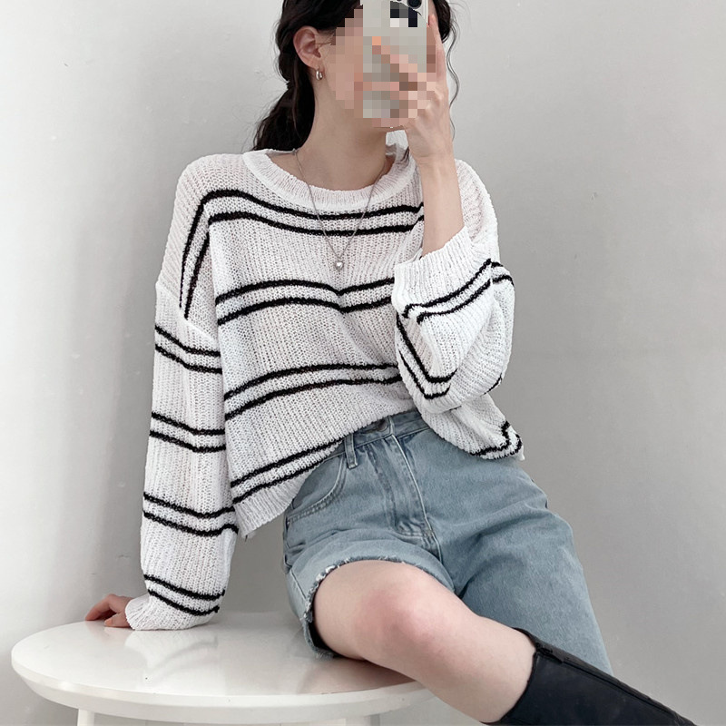 春夏薄手長袖ゆったり万能ニット中空ショートエアコンブラウスストライプ日焼け止めトップス