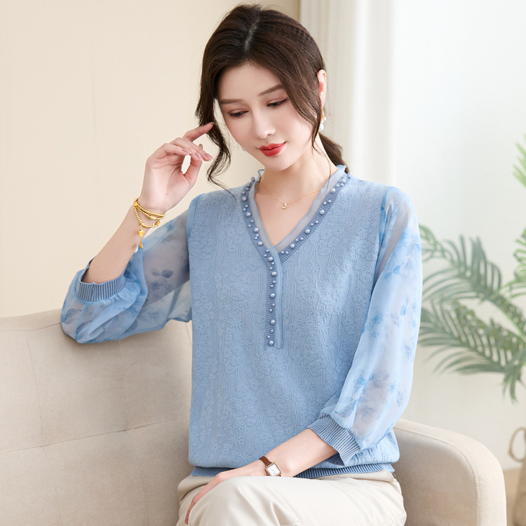 春のファッション刺繍入り女性用シャツ、春と秋の新しいルーズVネック、ウエスタンスタイルのウールアイスシルクフェイクツーピースニットトップ