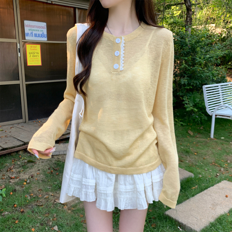 実物価格夏韓国風ラウンドネック薄手ウエストレースアップ竹麻日焼け止めブラウス万能ニットトップ