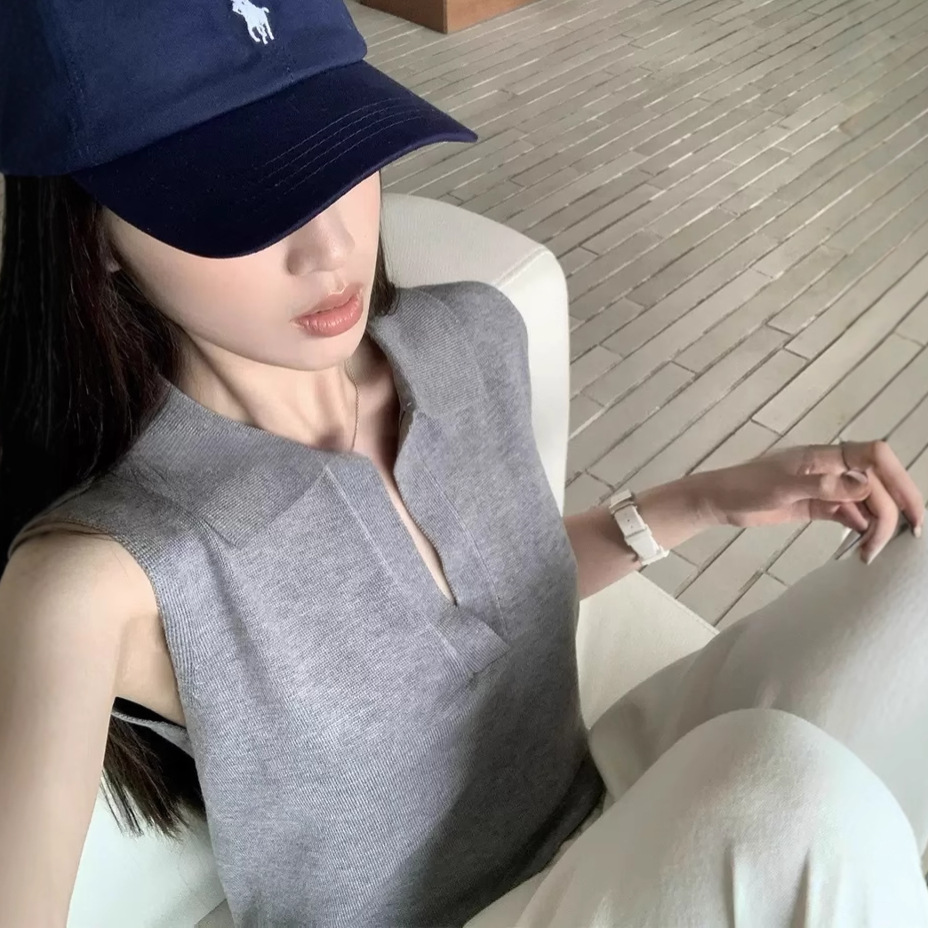 シルケットウールオールドマネーベストレディースポロカラーノースリーブトップカジュアルグレー半袖