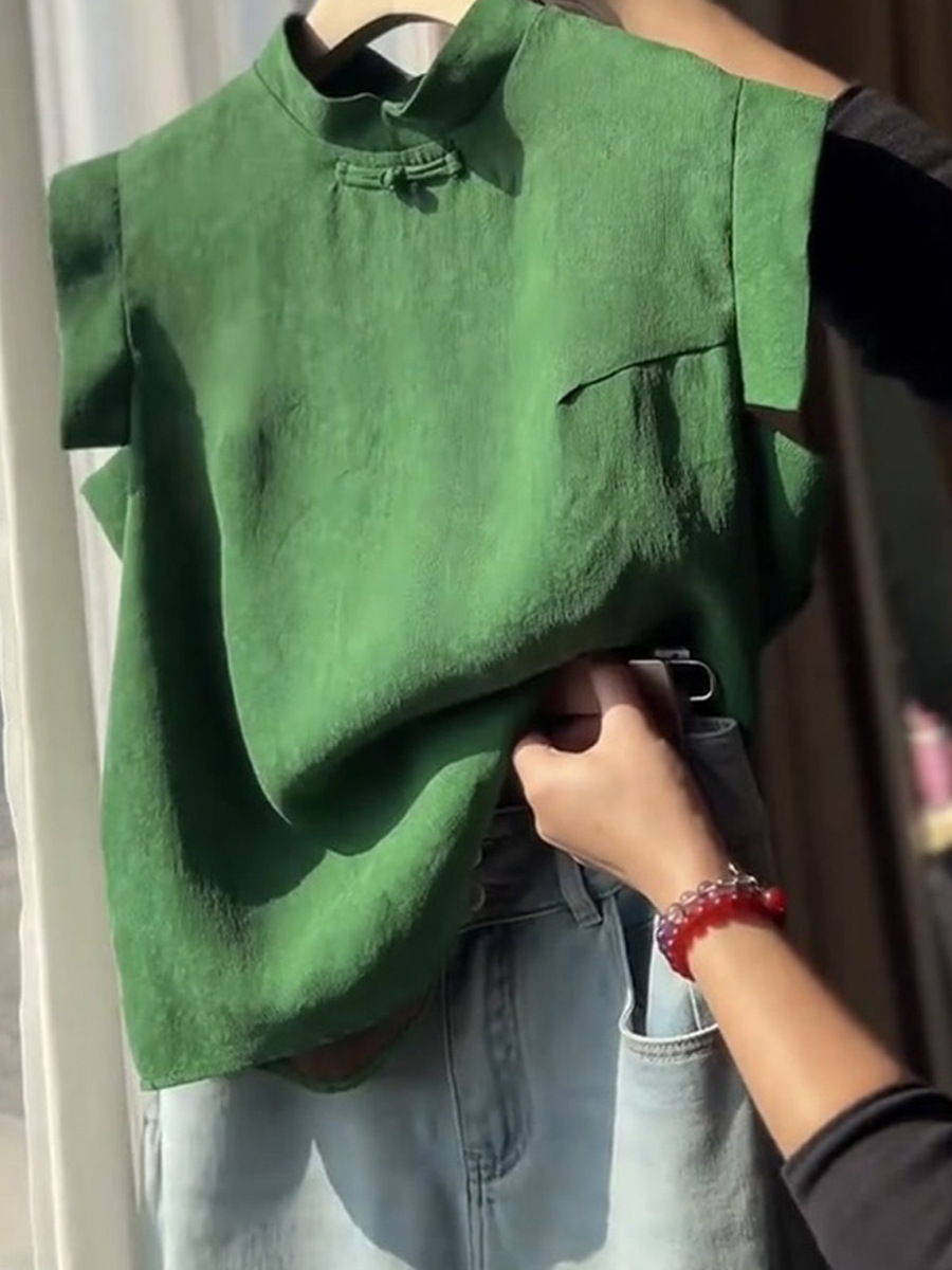 新しい中国風の気質 2025 ニッチレトロハイエンドグリーンホワイト優しいチャイナカラーショートスリムフィットノースリーブシャツ