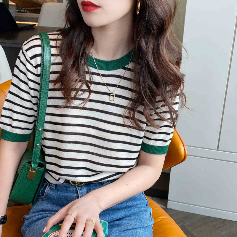ニット半袖レディース薄手シンプル2025新作夏初秋トップスショートルーズストライプTシャツ