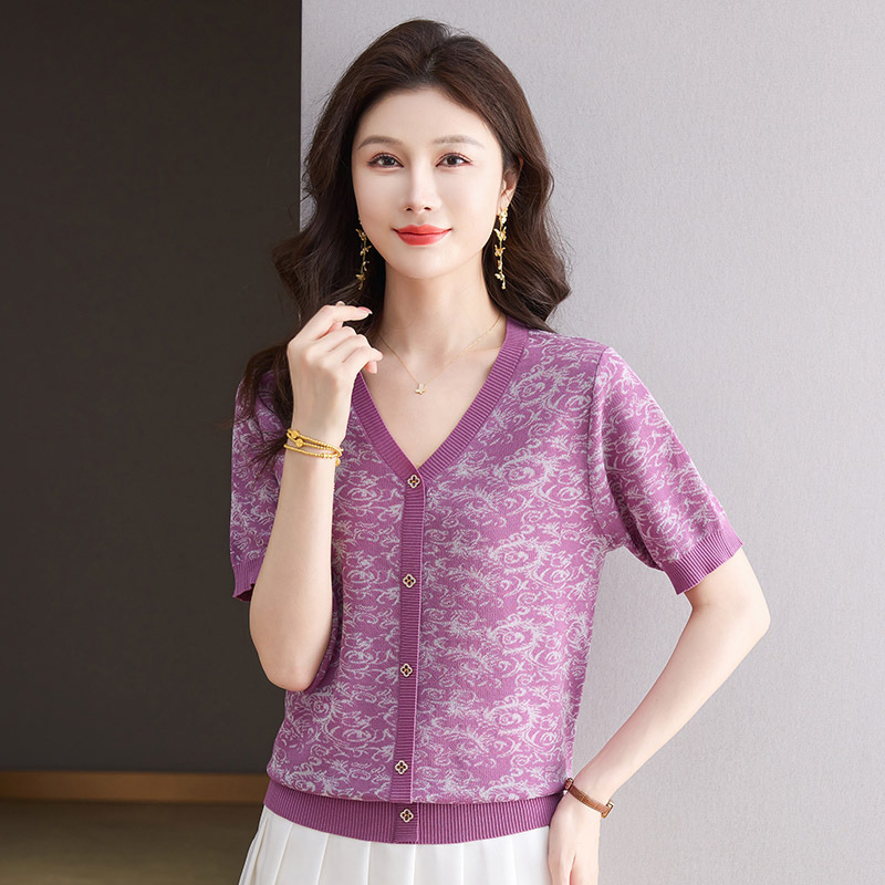 2025 夏スタイルニットトップスハートネックシャツ V ネックアイスシルク半袖ママ Tシャツトップス女性