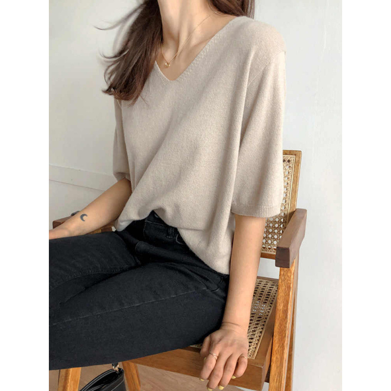 実物写真と実際の価格、夏の韓国風スリムVネック気質スリットシンプルで万能な着痩せニット半袖トップス