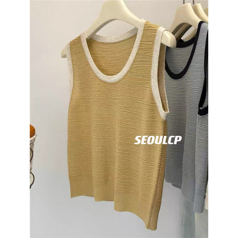 Xiaoxiangfeng 夏用の多用途なコントラストカラーのニットベスト、薄くて涼しく、わずかに透ける、ノースリーブトップ