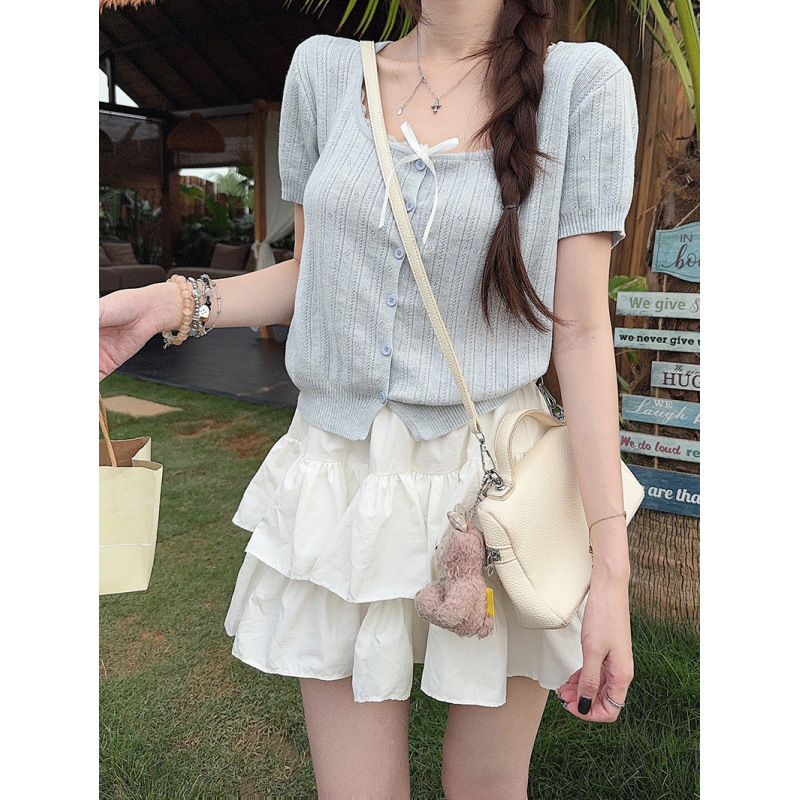 6枚のウール半袖Tシャツセーター2025年夏カーディガントレンディなレースショートラウンドネックトップス女性用のリアルショット