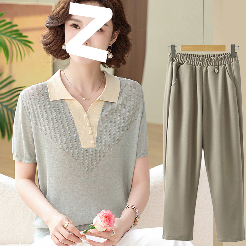 ママの夏スタイル半袖アイスシルクTシャツラペルニットトップス新商品40代50代中高年女性シャツ
