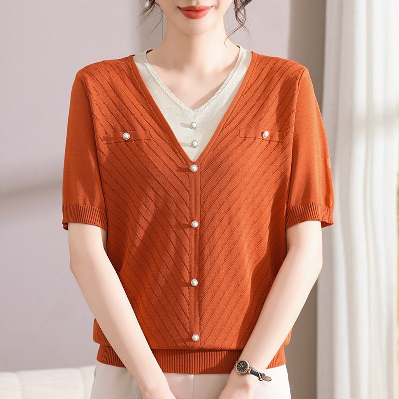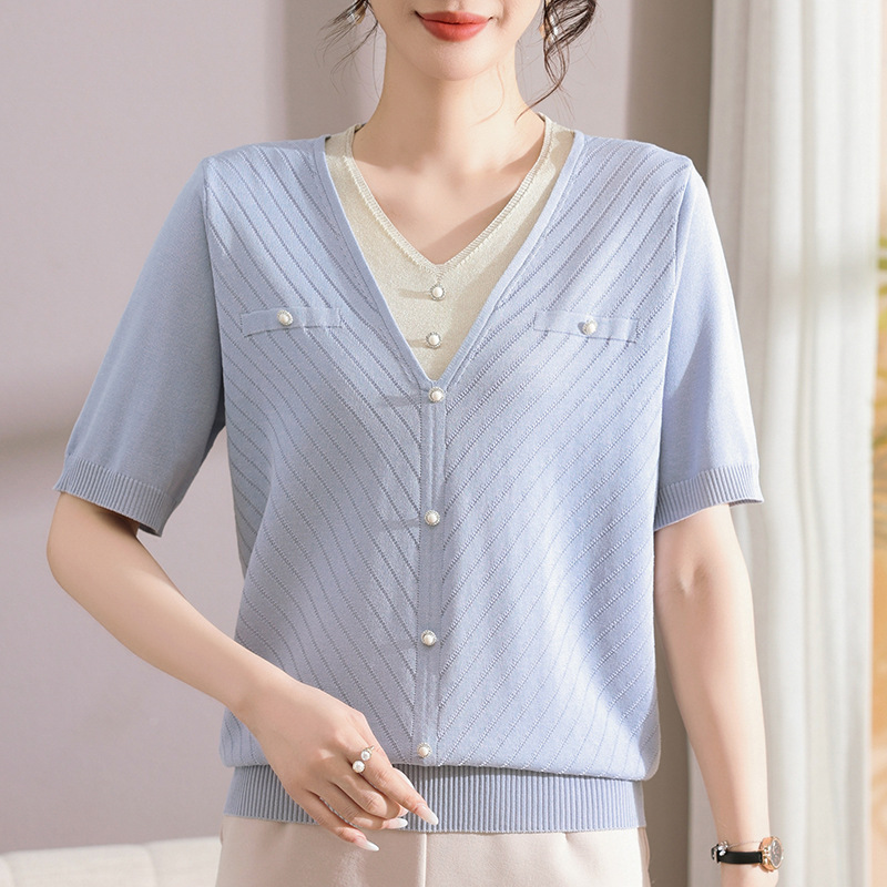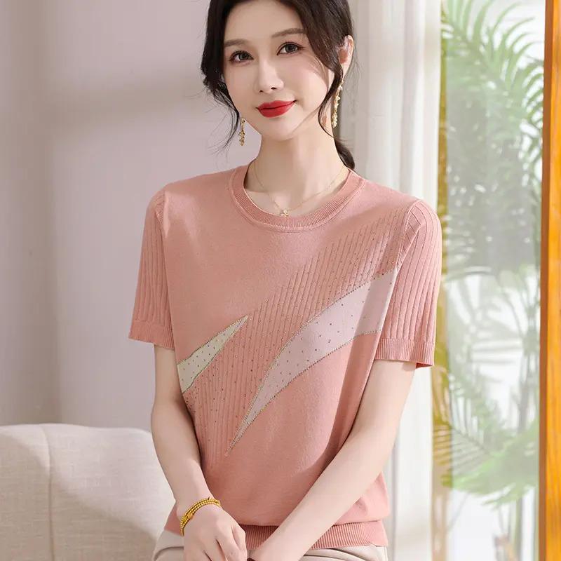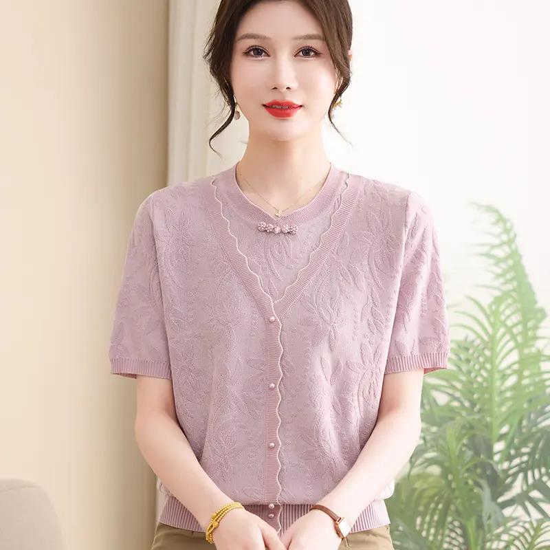 新しい中国風のVネックファッショナブルな無地半袖ホットダイヤモンドセーター中高年母親の春夏国民風トップス