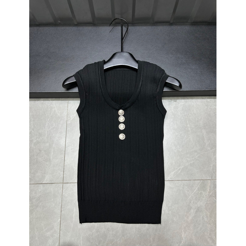 2025 新しい夏スタイルバーシルバーバックルノースリーブラウンドネックプルオーバーベストスリムフィット多用途女性ニットトップ