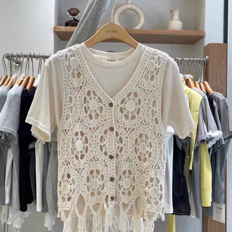 ボヘミアンレトロタッセル中空かぎ針編みニットベストレディースアウターレイヤードノースリーブベストショートトップ