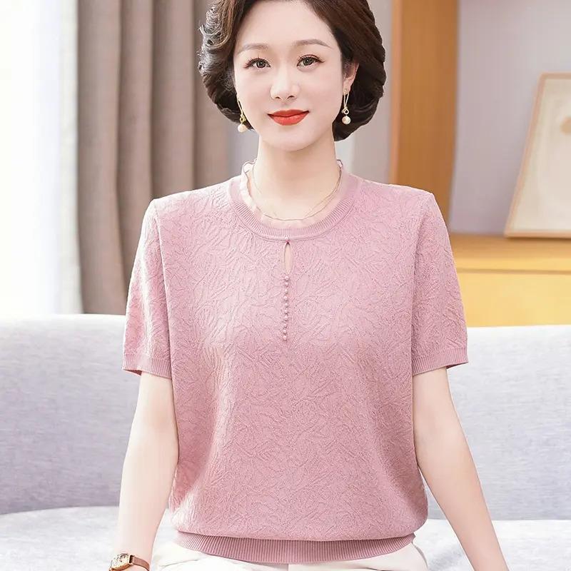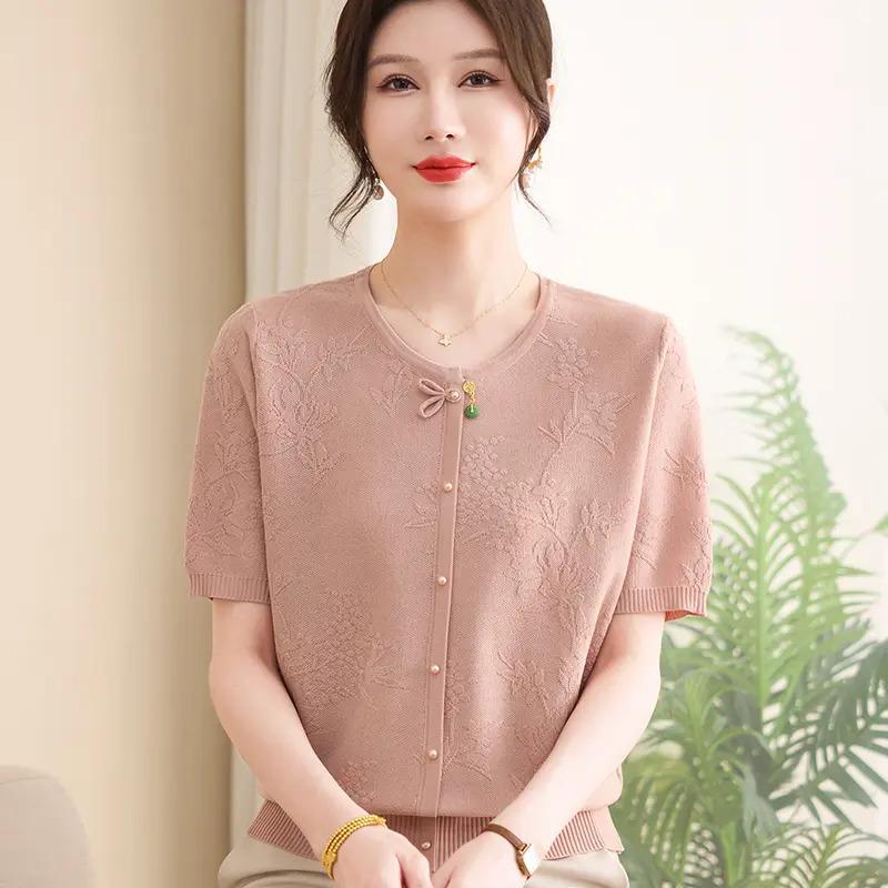 お母さんの夏服ファッション国風純色ジャカード半袖ニット中老夏新中国式薄いtシャツ