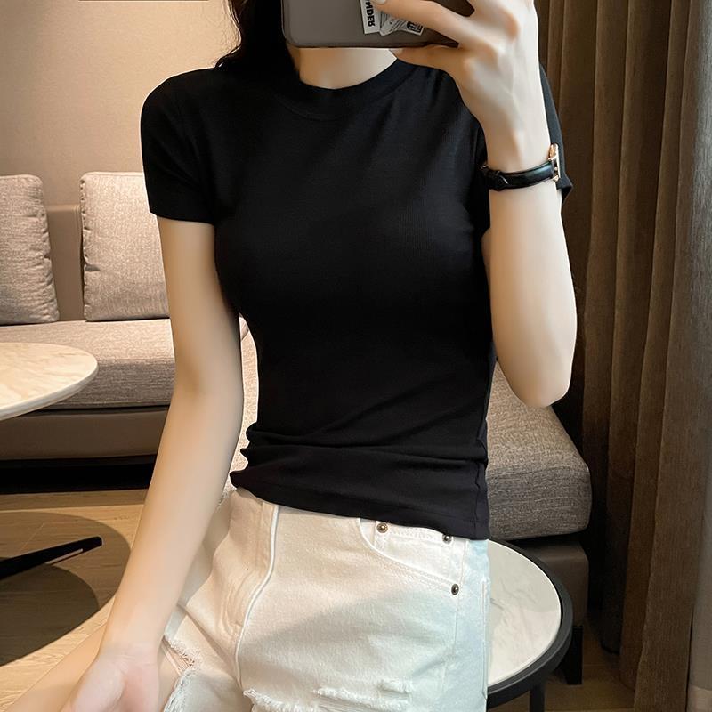 白い Tシャツレディース半袖 2025 春夏新作ハーフタートルネックボトリングシャツスリム半袖ニットトップトレンディ