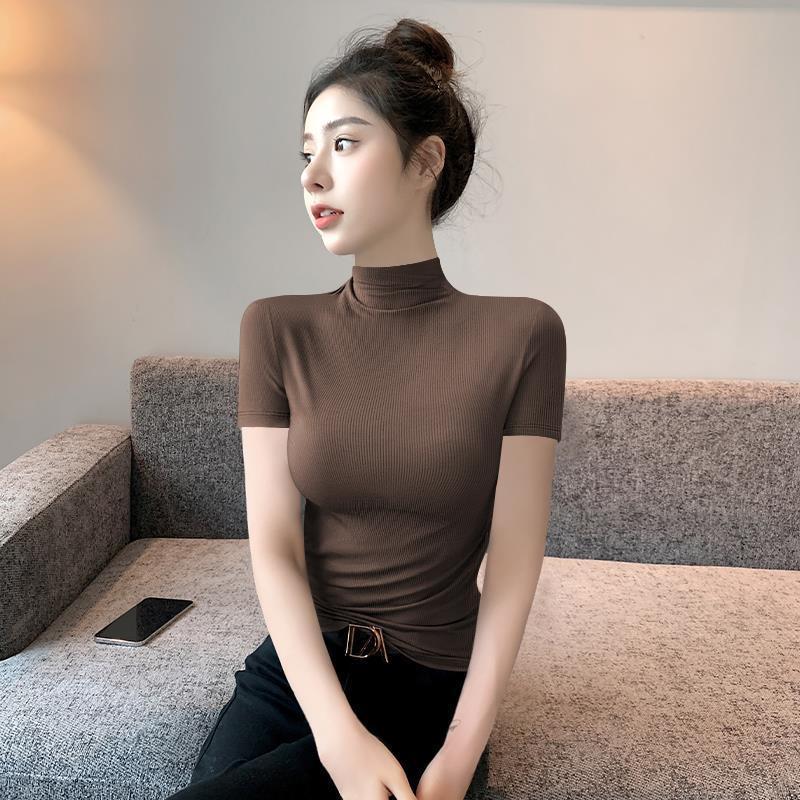 ニット半袖 Tシャツレディース夏ハーフタートルネック 2024 新しいアイスシルクミッドカラーフロントショルダーブラウンボトムスリムフィットトップ